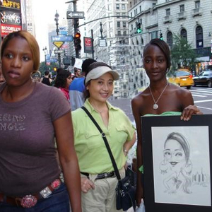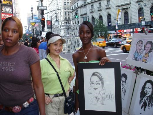 为了躲避恶性竞争,我尝试开创新的绘画作品。西方幽默启发了我的灵感,我发现漫画风格的肖像很受外国人欢迎。漫画要画好可不容易,要神似、形似,更要夸张。2000年元旦以后,我创作了一套独特风格的漫画肖像,很受外国游客青睐。那是10多年前的行情了,当年我可是时代广场第一位街头女漫画家哦。