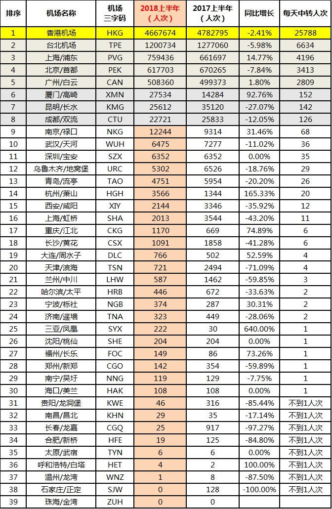 表3 :2018年1-6月我国机场国际中转旅客量排名
