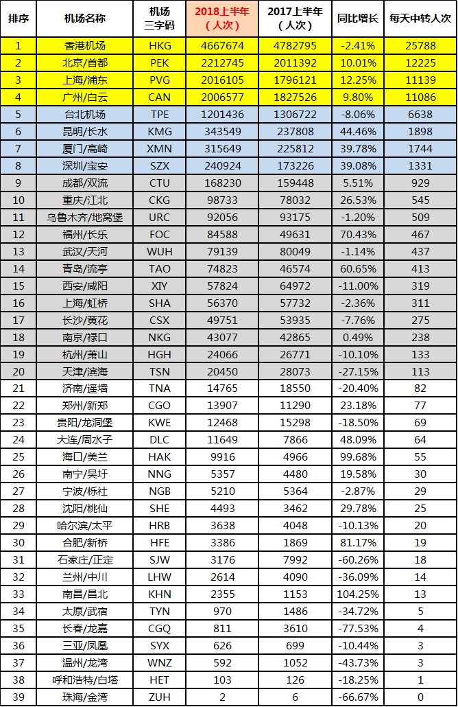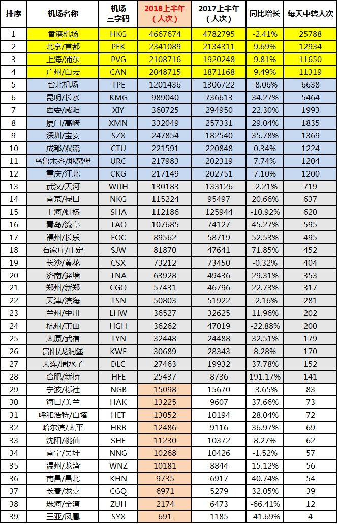 表2 :2018年1-6月我国机场境内转境内旅客量排名