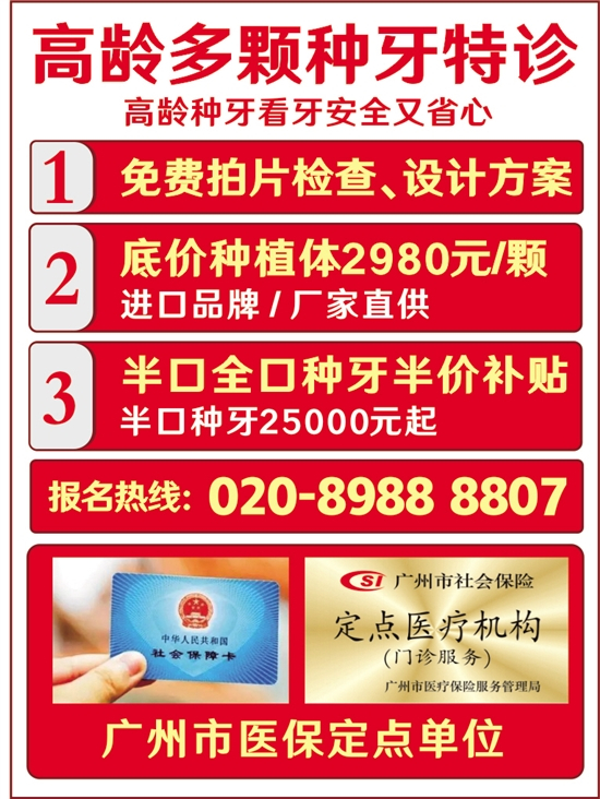 数据显示:我国60岁以上中老年人平均缺牙近 10颗,缺失率达86.1%,多颗缺牙成为中老年人身体健康的一大隐患。而传统种牙技术需要缺一颗种一颗,广州市某知名医保定点医院专项研发的ALL-ON-N桥式种牙技术,特别针对高龄半口、全口、多颗缺牙长者而研发,只需少量种植体就能恢复多颗牙。配合羊城“高龄多颗种牙”特诊半口、全口半价种牙专项补贴,种牙省钱又安心。目前,特诊还在报名中,电话:020-8988 8807。