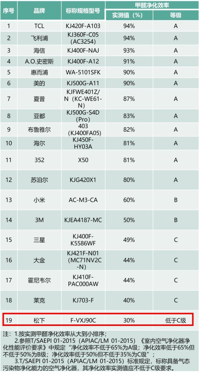 甲醛净化能力:松下一款产品未达国家标准