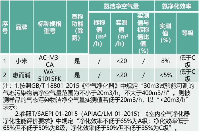 异味或臭味是人们比较敏感的空气质量问题。本次比较试验的19件样品中,有3件明确宣称具备氨气净化功能,有14件样品宣称具备除异味或除臭功能,但并未指明具体污染物种类。本次比较试验选取氨气为臭味或异味的特征污染物进行测试。结果显示,3件宣称具备氨净化功能的样品中氨洁净空气量均为<20 m3/h;氨净化效率方面,小米、惠而浦两款样品低于C级。