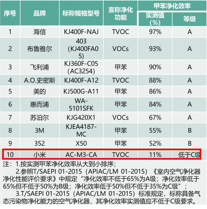 甲苯净化能力:小米一款产品净化效率低于C级