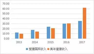 没有对比就没有伤害。数据显示,爱康国宾和美年健康在2015财年的收入分别达到23.96亿元、21.01亿元,爱康国宾依然是行业收入冠军,但二者差距已明显缩小。到了2016年,爱康国宾败下阵来,该年美年健康收入达到30.82亿元,以近8000万元的优势取代爱康国宾成为民营体检行业第一。