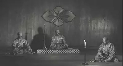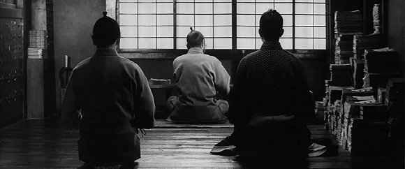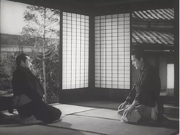 但若论全片空间结构着墨最重的地方,莫过于保本医生与红胡子之间的镜像对照关系。黑泽明电影中以镜像关系呈现代际间父权交替(如师徒、父子、君臣等)的表达非常常见,《影子武士》中三人分坐的镜像对照,《姿三四郎》中内凹直角二分构图的镜像关系,及《椿三十郎》远焦镜头中锥体三维构图等等。