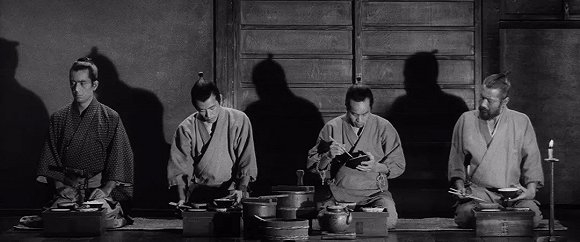 室内场景中,高对比度拍摄下光影运用,使事物和人物沿着每帧画面的边界延伸拓宽,从而增强画面的空间感。在红胡子中最为明显的一幕就是,开篇四名医生水平并排用饭,四个人物并排在同一水平线上面对镜头,横跨帧的宽度,后面紧靠着一堵墙,烛台映射出来的光在墙上投射出三个拉长的影子,保本医生的影子被有意识地切割在镜头之外,显示出其初来乍到时的格格不入。当“红胡子”起身离席,构图呈现三分结构,保本的影子出现在了镜头之内,明显地营造出人物心理隔离的关系。
