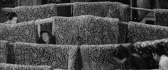 其余同样让人叹为观止的空间解构,如佐八在病床上回忆地震的场景,远焦镜头中远景人物的忙乱与近景人物的静态在画面上凝成一个中心点,动静在画面内完美交融;又如“小老鼠”在第一次出场中偷粥的立体构图,天台上被风扬起的被褥和衣裳形成开阔的远景,导演以一根悬挂的绳,连接其立体舞台空间的顶部、底部、近景、远景,在同一画面内呈现出空间错位而形成的并轨叙事线。