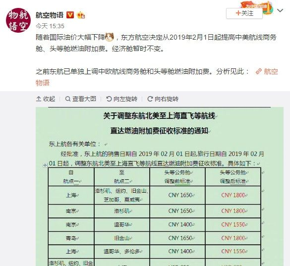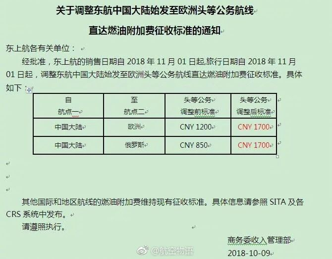 另外,之前东航已单独上调中欧航线商务舱和头等舱燃油附加费。