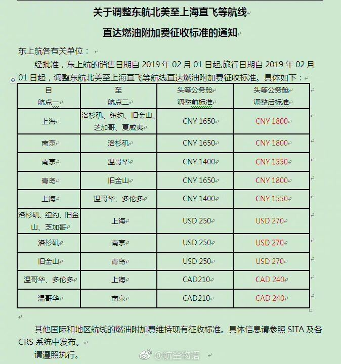 民航资源网2018年12月25日消息:据民航自媒体 @航空物语25日微博消息,随着国际油价大幅下降,东方航空决定从2019年2月1日起提高中美航线商务舱、头等舱燃油附加费。经济舱暂时不变。