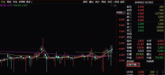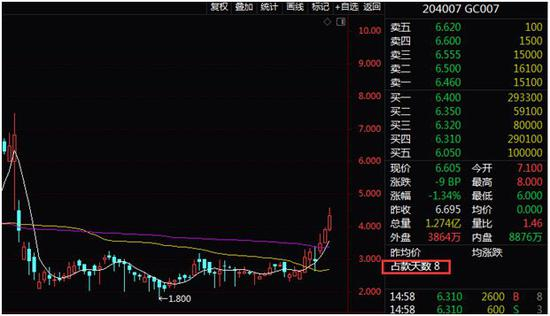 以沪市7天逆回购品种GC007(代码:204007)为例,该品种今天盘中收益率一度达到8%,如果今天盘中按照此收益率做一笔逆回购,资金实际占用天数为8天,就能按照8%的年化收益率收取8天的利息。该品种昨日收益率也一度高达8.390%。