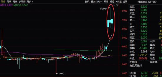 行情数据显示,沪市逆回购3天、4天、7天等品种,以及深市3天、4天、7天等品种近日盘中均出现收益率飙升情形,这其中沪市和深市7天等品种年化收益率近日一度超过8%,远超同期市场上宝类品种收益率。