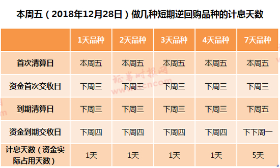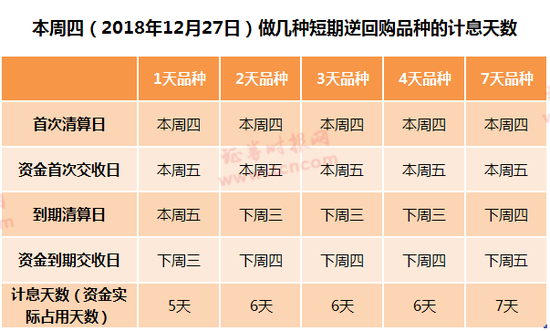 若在本周四做7天以内逆回购品种,各项品种的计息天数也均为5天~7天不等。