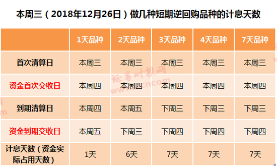 如果在本周三做7天以内逆回购品种,除了1天品种计息天数为1天外,其他几个品种计息天数均为6天至7天。