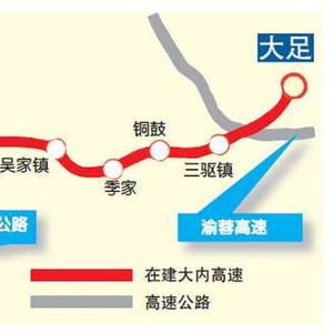 来自市交通局、中国铁建重庆投资集团有限公司消息称,大内高速重庆段起于大足区三驱镇,接渝蓉高速,向西与在建潼荣高速相接,经季家、铜鼓,止于川渝交界处荣昌吴家镇南侧,与内江至南溪高速公路相接。