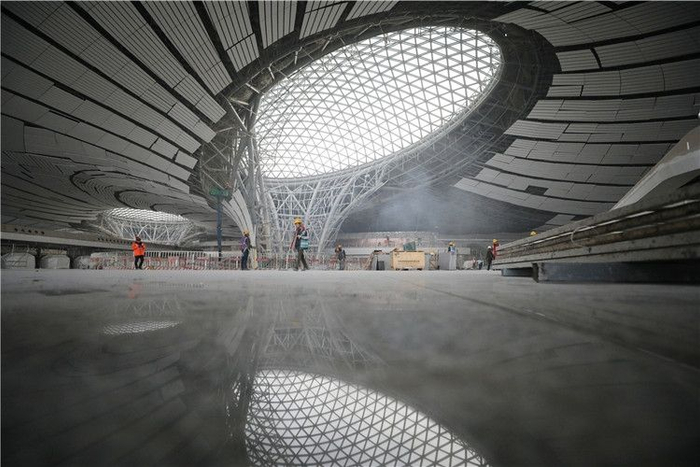 截至目前,主航站楼室外装饰已全面亮相,完成了18万平方米主航站楼外装饰金属面板的安装工程;高架桥实现通车,室外道路全面贯通,除面层沥青外其他工序均已完成;完成了1500多公里的电缆铺设任务,25万台(套)空调机组、配电箱柜的安装和单机单系统的调试工作,楼内已具备通电、供暖条件。预计年底机电设备安装全部完成、单机调试完成。目前,正在加速推进室内精装修施工,已完成总量的80%。