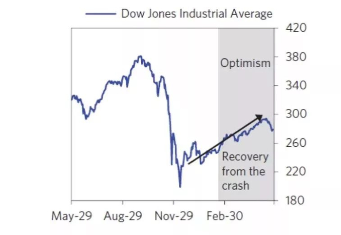 到了1930年,许多人认为股票市场50%的调整已经结束,开年的四个月市场开始反弹。当时没有看到公司盈利的下滑,许多公司变得便宜。到了3月,美联储降低利率到3.5%,5个月内下调利率2.5%。到了3月25日,国会又通过了两个铁路基建项目,将带了1%的GDP增长。大部分经济学家认为,财政刺激将带来经济的增长。银行业到了1930年初,又开始进行扩展。道琼斯到了4月10日反弹到了290点以上。在我们的去杠杆初期,许多人都会低估经济衰退的严重性,这时候的经济政策往往不足够。