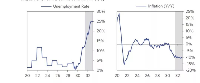 到了1932年后期,美国国内失业率达到了25%。而这一次大萧条也导致了全球的保护主义崛起,进而引发了后来的战争。在德国,希特勒在选举中获胜。1931年日本入侵东三省,1932年入侵上海。美国国内也引发了大规模的民粹主义。之后几年,第二次世界大战将全面爆发。在危难时刻,老罗斯福当选美国总统,将美国从大萧条中真正拯救了出来。下图我们看到,在罗斯福当选的时候,美国失业率达到了惊人的25%,通缩也是在10%的水平。从投资时钟看,是最差的宏观经济基本面。