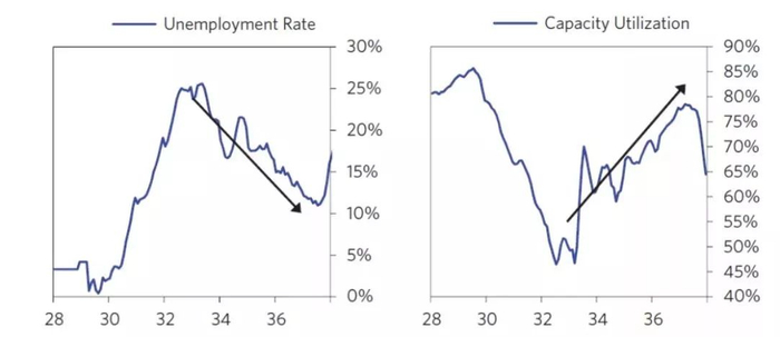 1933到1937年,开始了一轮完美的去杠杆。3月5日,在正式上任后的第二天,罗斯福宣布禁止黄金出口。在银行开门之前,出台了法案,将通过美联储给银行提供流动性。这些流动性可以基于银行资产提供,而非黄金,这就打开了美联储印钞机。这样,美联储一边印钞,另一边又不需要担心黄金储备被挤兑。3月12日,在银行开门的前一天晚上,罗斯福又向全国人民进行了广播,表示美联储的12家银行将提供充足流动性。第二天,大家都在紧张等待银行开门,不知道民众又会抽走多少资金。让所有人意外的是,大众居然向银行存入了10亿美元资金。这是一个经典的资产和债务案例。当大家认为资产没问题时,债务也会逐步解决。越来越多银行终于开门了,发现不再有挤兑风险。道琼斯也出现了单日15.3%的涨幅。