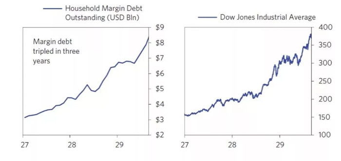 刺破泡沫的是流动性收紧,具体发生的情况是:1929年3月第一次看到了泡沫问题。到了1929年中,6月美联储会议纪要显示工业增加值和工厂雇佣人数创历史新高。5月股市短暂回调后,6月大涨11%,7月上涨5%,8月上涨10%。股票市场的上涨继续由家庭杠杆率推动,6到8月美国家庭的债务增加了超过1.2万亿。到了8月8日,美联储加息到6%,显示了强硬的调控措施。经纪商收紧了电话贷款市场的放贷,保证金比例从前一年的10%大幅提高到45-50%。道琼斯在9月3日达到了创记录的381点后,之后25年再也没有创出新高。