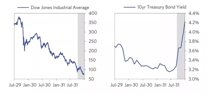 到了1931年的四季度,由于全球其他货币都在对美元贬值,美国出现了通缩型衰退。美国的大萧条向全球扩散。1931年9月,道琼斯单月暴跌30.7%,是大萧条以来最大的单月跌幅。到了10月5日,市场单日暴跌10.7%。纽交所停止了做空机制。此前的大幅上扬的避险资产美国国债,也被大举抛售,投资者担心美国没有能力偿还债务。由于对于银行的担忧,大部分银行抛售债券来保持现金比例。