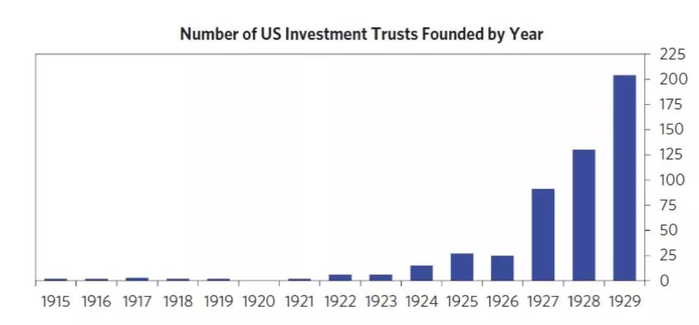 投资信托是另一种金融创新,带来了大量的新投机者。这些信托公司通过发行股票,购买其他公司的股权。如果你没有足够的钱买入多家公司股票,那么这种投资信托就是最好的品种。通过组合,让你享受到多个公司的股票。下图我们看到,投资信托的成立大规模增长。