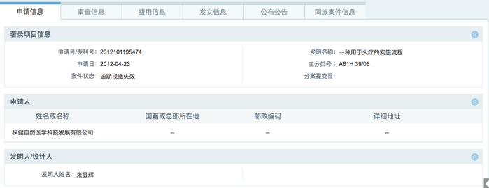 需要注意的是,“一种用于火疗的实施流程”和火龙液的专利申请目前均处于失效状态。根据知识产权局官网上的法律状态显示,这两项专利都于2015年12月16日失效,目前为“逾期视撤失效”。