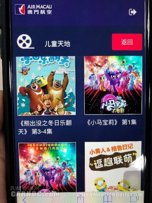 栏目总类比较丰富,有电影频道、电视频道、游戏频道、多彩澳航、儿童天地等。关于这个栏目选择,我觉得澳航还是考虑很体贴,专门针对儿童提供了一个儿童栏目。除了国产的熊出没以外,还有国外的小黄人等热门IP动画,以后带小孩坐飞机的家长想必也不用担心小孩哭闹了。