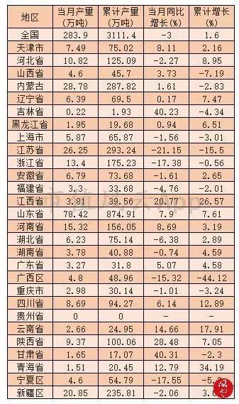 2018年1-11月我国烧碱折百产量累计达到3111.4万吨,分省市统计如下表: