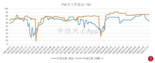 从开工率看,环渤海地区冬季限产导致华北地区PVC企业的开工率逐步下降,11月份后开工率低于70%,华南地区PVC企业的开工率保持相对稳定在80%左右。PVC开工率的下降也对上游烧碱的需求减少的重要原因。