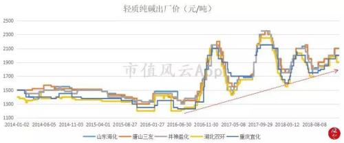 煤炭价格在2015年4季度触底后,随即迎来快速上涨,由此引发下游行业成本快速上涨,纯碱价格也跟随震荡上涨,见下图: