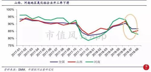 根据SMM(上海有色网)统计,2018年前8个月因矿石供应不足导致国内氧化铝减产达16万吨,山西、河南两省氧化铝厂的开工率在7、8月出现了明显的下滑。
