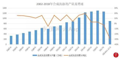 2002年到2017年,国内合成洗涤剂产量从328万吨增长至1266万吨,年复合增速为9.41%。2014年产量达到1200万吨后,增速下滑明显,2015、2016年保持3%左右的年增速,2018年以来受环保督查、企业夏季检修等因素影响,前11个月洗涤剂产量增速同比大幅下滑近30%。