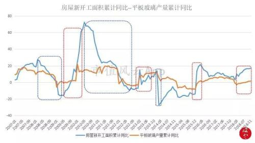 从上图可看出,房屋新开工面积累计同比略微领先平板玻璃产量累计同比,房屋新开工面积增速下滑(蓝框),平板玻璃增速(蓝框)跟随下滑,房屋新开工面积增速(红框)上行,平板玻璃增速(红框)跟随上行。