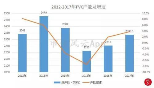 从产能看,在经历了2014/2015年的产能重组后,目前产能基本变动不大。截至2017年年底,国内PVC在产企业产能统计在2336.5万吨(含糊树脂),较2016年增加83.5万吨,其中PVC粉料产能在2192万吨。