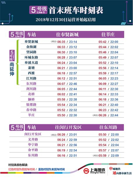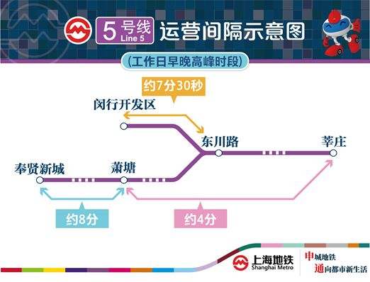 5号线主线段工作日早晚高峰时段开行大小交路,其中大交路为:莘庄站——奉贤新城站;小交路为:莘庄站——萧塘站。工作日平峰时段及双休/节假日开行莘庄站——奉贤新城站单一交路。5号线支线段开行东川路站~闵行开发区站单一交路。