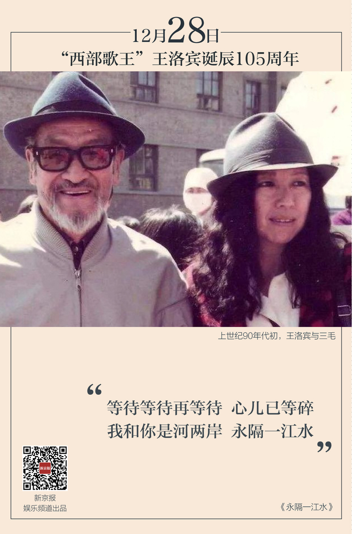 这位“西部歌王”的传奇经历和音乐才华吸引了台湾女作家三毛。上世纪90年代初,三毛远赴新疆拜访王洛宾,两人遂成忘年交。在三毛自缢身亡之后,王洛宾悲痛不已,善感的他写下了《等待——寄给死者的恋歌》。