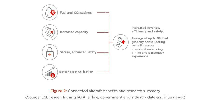 互联飞机在以下方面有助于提高效率,包括燃油消耗和排放、飞机维修、飞行操作、空域容量和安全。巩固这些优势可以带来巨大的经济,环境和社会效益,包括减少该行业的年度全球燃料使用和净减少二氧化碳排放量。