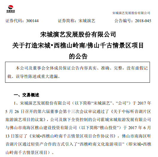 12月28日,宋城演艺发展股份有限公司发布一则《关于打造宋城·西樵山岭南/佛山千古情景区项目的公告》,宣布将由宋城演艺以4.49 亿元受让宋城•西樵山岭南/佛山千古情景区项目公司100%股权,并后续自主打造佛山项目,一期总投资 7 亿元,已相继于与樵山投资签订《股权转让协议》、佛山市南海区人民政府签订了《企业投资协议书》。