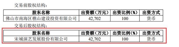 本次公告披露,樵山投资将持有的佛山市南海樵山文化旅游发展有限公司100%股权以44895.08 万元(第三方资产评估)的价格,转让给予宋城演艺。同时为扶持本项目,樵山投资同意给予项目公司进驻扶持资金人民币 3.7 亿元整,专项用于本项目。