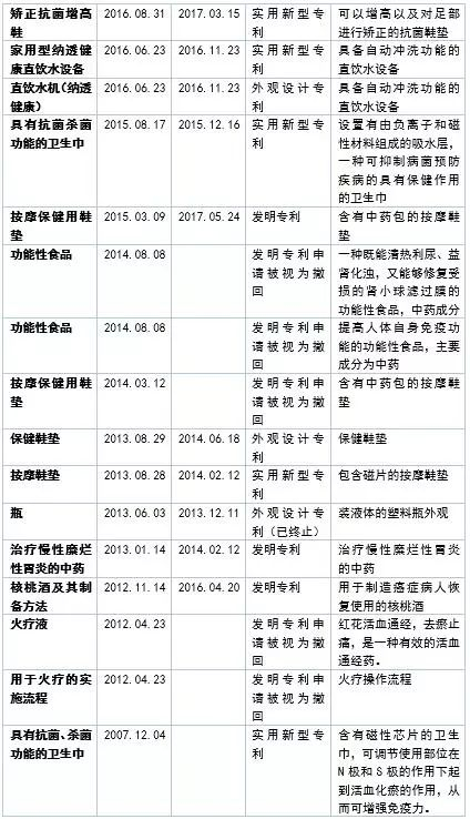 由发明专利转为使用新型专利的情况,在鞋垫相关的产品上也有体现。在2006年12月,束昱辉提交了“一种利用中医原理和人体工程学、磁力学原理能够调节人体生物磁场的按摩鞋垫”的发明专利和实用新型专利的申请,结果也是后者获批。