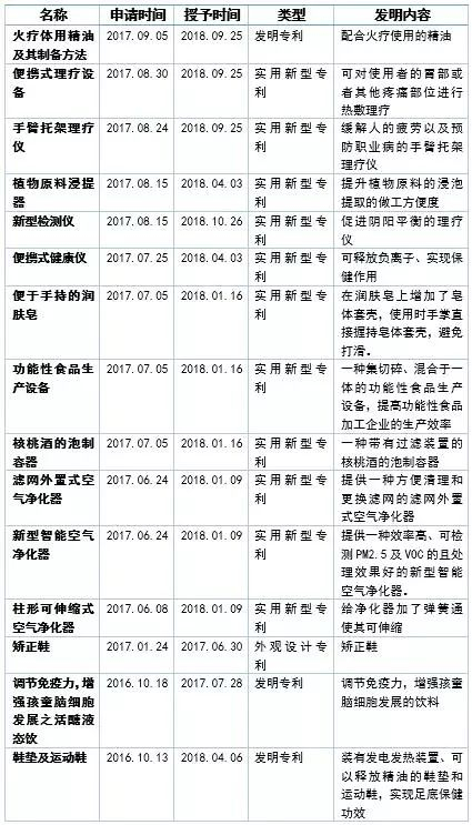 除上文提到的发明创造,束昱辉的专利还涉及保健仪器、空气净化器、净水器、精油制备方法、核桃酒制备容器等。