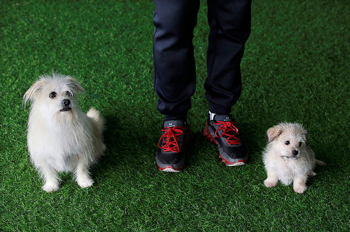 动物训练师何军和他九岁的宠物狗“果汁”以及两个月大“果汁”克隆体“汁汁”合影。正如该公司首席执行官所说,越来越多的宠物主人希望他们的宠物陪伴他们的时间更长。