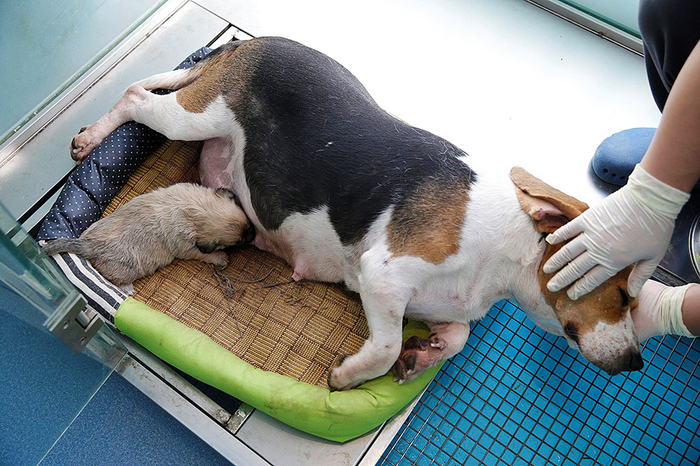 编号NTR1917的Beagle犬(宠物狗“果汁”的代孕犬)在进行代孕手术。