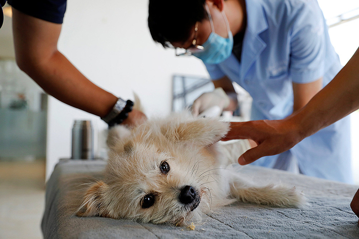 工作人员从九岁的宠物狗“果汁”体内提取基因样本。