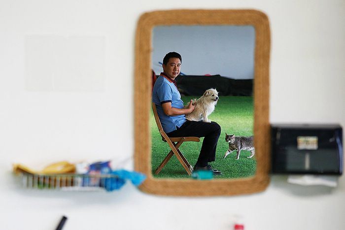 动物训练师何军抱着他的宠物狗“果汁”。
