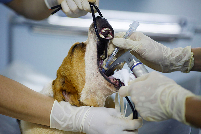 编号NTR1917的Beagle犬是宠物狗“果汁”的代孕犬。实验室里,技术人员在给它做手术前的准备工作。