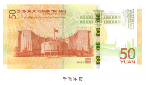 纪念钞背面主景图案为中国人民银行大楼,辅以牡丹花、中国人民银行旧址、第一套人民币发行布告及城市建筑剪影图案。票面左上角为面额数字“50”,中国人民银行汉语拼音字母和蒙、藏、维、壮四种民族文字的“中国人民银行”字样与面额。票面下方为行长章与年号文字“2018年”。票面右下角为面额数字“50”,汉语拼音字母“YUAN”。