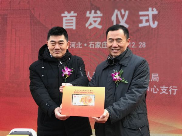 12月28日,人民银行办公厅副主任王均坦向人民银行石家庄中心支行行长陈建华移交J000000001号纪念钞