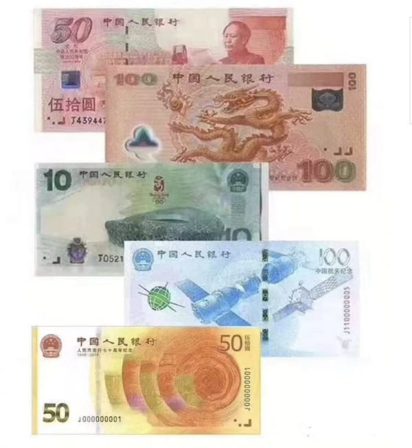 我国发行过的纪念钞“家族”,分别为1999年的建国50周年纪念钞、2000年的千禧年龙钞、2008年的“第29届奥林匹克运会会”10元纪念钞、2015年的100元中国航天纪念钞和人民币发行70周年纪念钞。