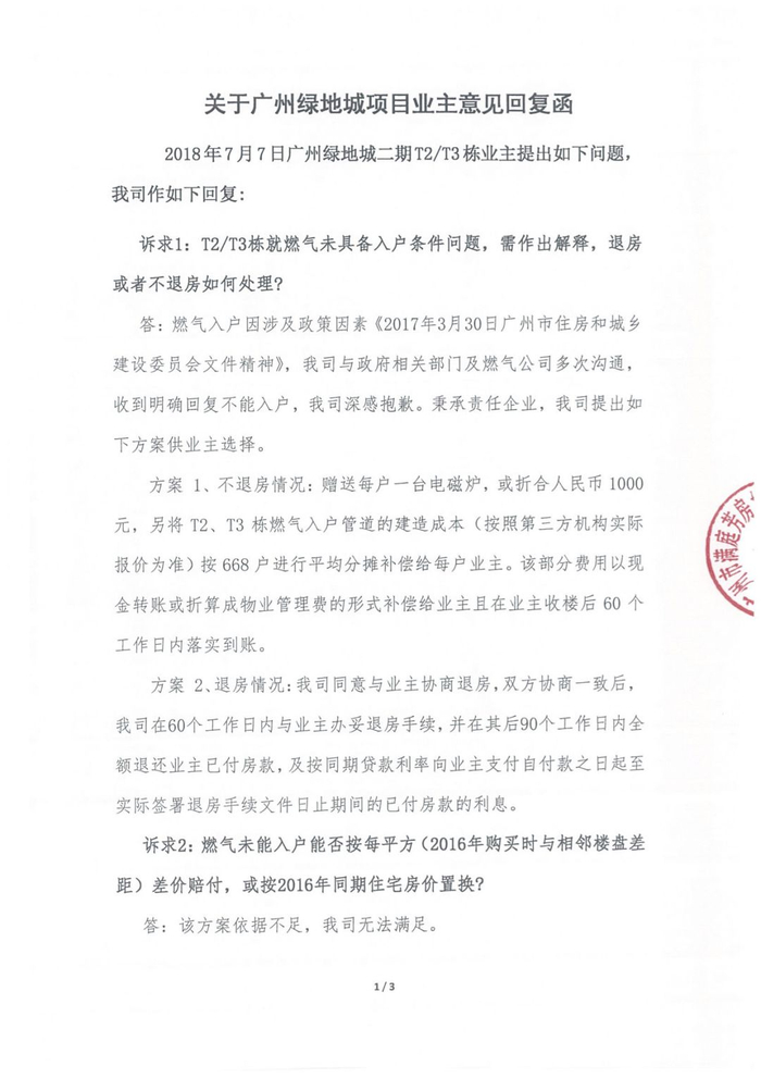 当年的“明火入户”广告宣传,如今已被证实确认无法实现。作为开发商,当年是否报建了燃气入户项目,且相关部门是否批准了该项目报建,满庭芳和绿地方面均未给出回应。今年7月份开发商《关于广州绿地城项目业主意见回复函》也并无针对当年广告宣传是否存在虚假的任何回应。